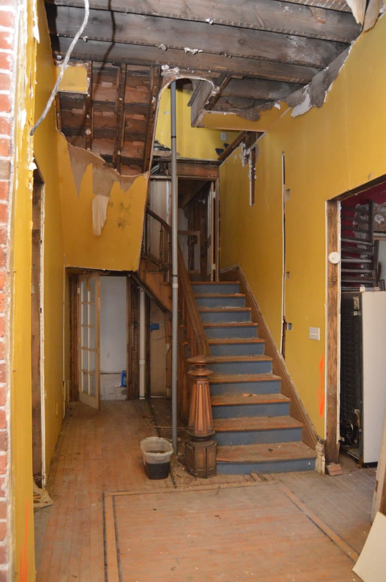 The interior of the house was in utter shambles. The previous owner had stripped it of 95% of the original woodwork and doors, and the second floor was nearing collapse. It was cluttered with debris and freezing cold. One at a time we could hug the wall to go up the stairs to the second floor, then could go no further.